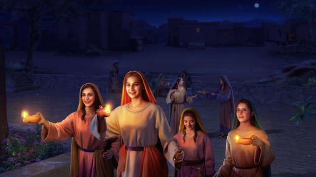 “그 때에 천국은 마치 등을 들고 신랑을 맞으러 나간 열 처녀와 같다 하리니 … 슬기 있는 자들은 그릇에 기름을 담아 등과 함께 가져갔더니 … 밤중에 소리가 나되 보라 신랑이로다 맞으러 나오라 하매 이에 그 처녀들이 다 일어나 등을 준비할쌔 … 예비하였던 자들은 함께 혼인 잔치에 들어가고 문은 닫힌지라”(마태복음 25:1~10)